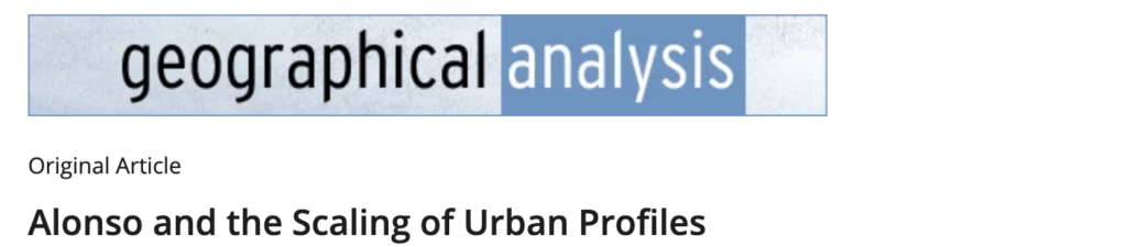 Justin Delloye, Rémi Lemoy (now at UMR Idées, Rouen) and Geoffrey Caruso just published an article where they reconcile Alonso and the scaling literature. This is done through an augmented micro-economic model where scaling exponents are explicit and the scaling with population of the profile of residential land is exogenously given to better suit empirical … Continue reading Now there is a formal link between standard intra-urban theory of residential choice and population scaling as of urban systems theory! A must read in Geographical Analysis